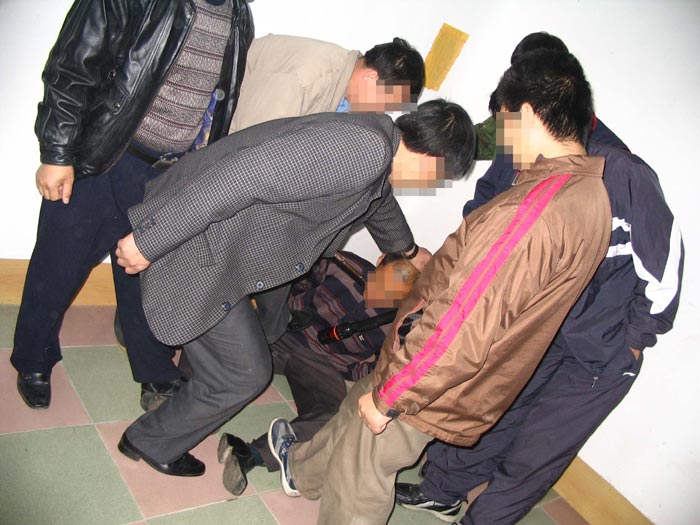 2000年12月23日,我和同修在发真象材料时,被不明真象的人举报,绑架到吉林市长春路派出所。我当晚9点被抓,一直酷刑折磨到第二天3点,有拳打脚踢,扒光衣服推到外面(图2),那年的冬天是近年来最冷的一年。我就大喊:都来看吧,警察就是这样对待法轮功学员的。他们怕恶行让世人知道,就把我拽回来一顿毒打,然后脚踩在身上往身上浇冷水(图3),几个小时的酷刑折磨也没问出一个字,就把我铐在自来水管上猛踢阴部。 (图4)