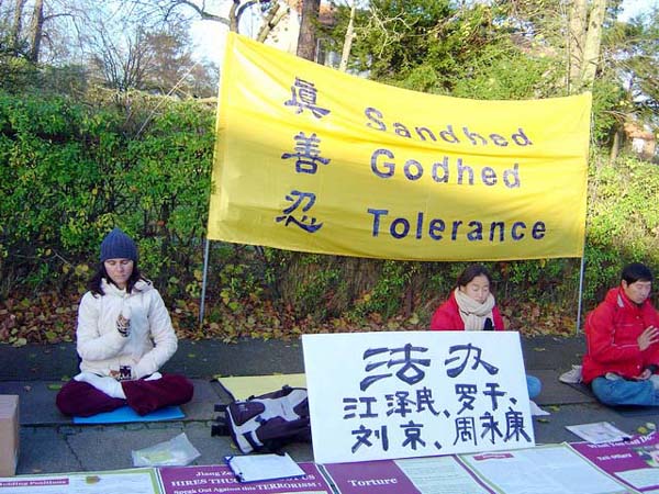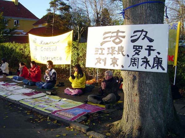 丹麦、瑞典法轮功学员在中使馆前呼吁法办江罗刘周(图)