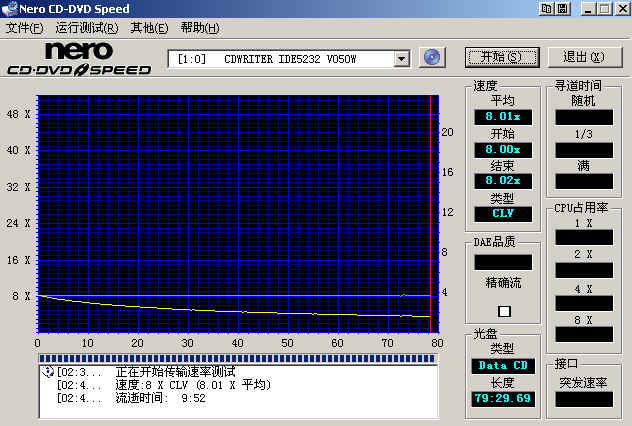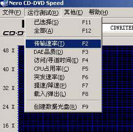 1、把空白刻录光盘放入刻录机,从“开始”菜单中打开Nero CD-DVD Speed(图1),在主界面中选择“运行测试-传输速率”(图2),程序就开始测试光盘的刻录速率。