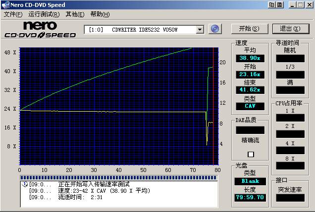 上图是KONA世纪之果白金盘的测试结果,左侧纵坐标为刻录速率,绿线表示刻录速率的变化,右侧纵坐标为刻录机电机的转速,黄线表示电机转速的变化。从图中可以看到在我的刻录机上此盘最高刻速可到50×以上,达到最大刻速后我的刻录机自动降低了刻速。右侧显示框中平均刻速为38.90×,然后我分别用40×、32×、24×、16×刻了4张盘。我没有试验48×下的刻录质量,是觉得此刻速下光盘的旋转速度很高,对刻录机和光盘的质量要求都很高,所以不选用。而且即使是号称世界上质量最好的PLEXTOR刻录机的52×机型也建议用户使用40×刻录。