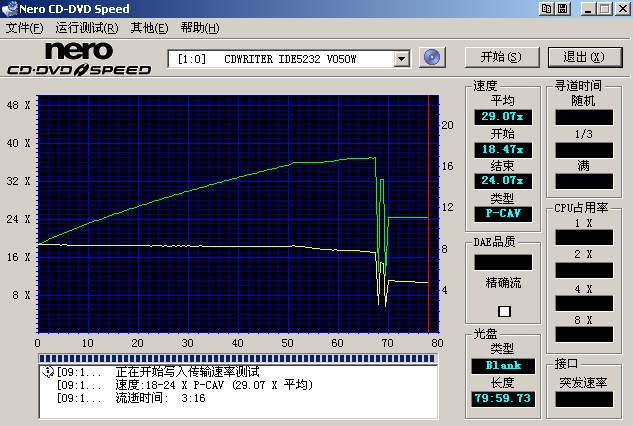 上图是TOYAMA水蓝盘的测试结果,在我的刻录机上最高刻速可到37×,右侧显示框中平均刻速为29.07×。然后我分别用32×、24×、16×、8×刻了4张盘。
