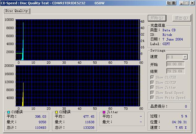 再就是检测速度,理论上,光盘的错误标准基本上是按1X速度时所制定的,也就是说,光盘只要能在1×的速度下达到相关的质量标准就被认为是合格的。光盘读取速度越高出现读取错误的几率也就越大,所以光驱读盘时当出现读取困难时都会自动降低读盘速度的。目前用自己的刻录机进行C1C2测试的人大多选用8×速进行。在我的刻录机上,我用8×检测这批光盘中质量不错的,在20×检测时C1C2值都很大,但是在VCD机和刻录机、华硕40×光驱上都能流畅清晰播放。因为我的刻录机最高读盘速度为52×,所以播放时会经常调整读取速度,而华硕40×光驱则以6×速起始读取并缓慢提高到16×速,全程稳定没有降速。我对此的理解是这些光盘能够满足低速读取的要求,高速读取时则会出现大量读取错误必须通过降速来读取。对于我们来说,因为刻出的盘主要是VCD,而VCD机的播放速度是低倍速,所以我认为用8×检测质量好即可,不需要高速检测有多么好的质量,当然如果高速检测的结果也不是很坏,那就是极品了。若使用4×进行检测,时间会加倍,而结果与8×检测接近。如果低速检测时出现了C2,那么这张盘的质量实在说不过去了。