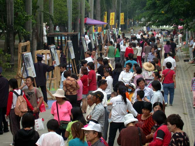 整个下午人潮一波又一波。群众中有许多人听过真象后立刻拿起手机,把家人、朋友全找来,要学员再详细的为他们说明。一位外籍人士,早上在公园运动时看到了展板,也与学员做了交谈,明白真象后,下午带着他的一对儿女来了。一个画面一个画面的详细为孩子介绍,宛如上了一堂活生生的人权教育课程。