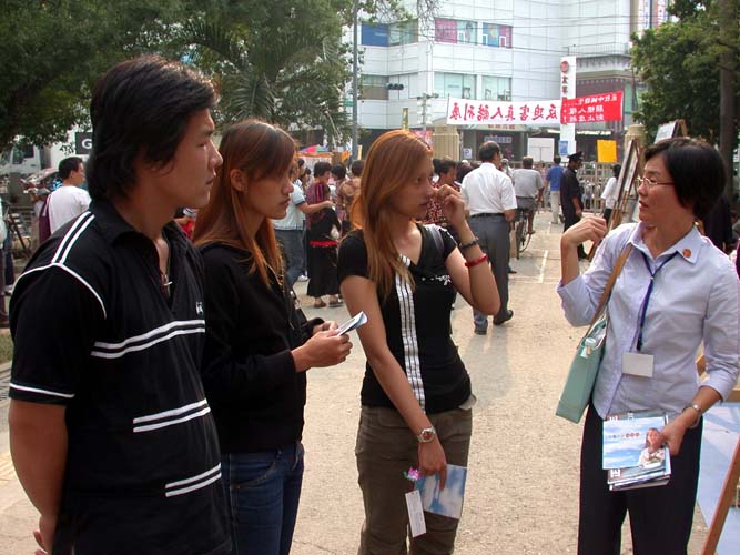 一位推着婴儿车的聋哑人士,仔细的看了所有的真人演示后满脸疑惑,她表示自己识字不多,所以展板上的说明看不全,于是现场的学员一字一句耐心的说给她“看”,就这样她靠着读唇语明白了真象。当她知道这个展示只此一天,相当懊恼,因为她想拍照却未带照相机,家住邻乡路程颇远。结果过了一个多小时后,她竟带着照相机出现在现场,一直到活动结束。