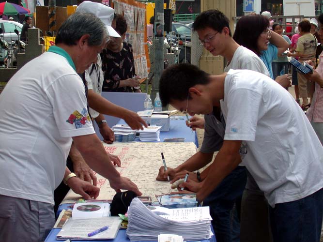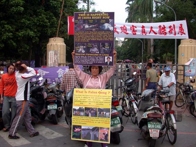 一位满身酒气的男士,不发一语的看着全场。学员上前与他交谈讲真象,只见他的神情由原本的微醺,到逐渐清醒。最后他说:“我去过福州,你们讲的情形我很清楚,确实是这样。”接着表示:“看了这个场景,我的心很痛。”