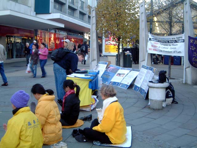天气很好,有着温绚的冬阳以及宜人的气温,数以千计的群众路过学员的请愿区。学员们在上午近11时30分时抵达雪菲尔市中心,随即展开四面大型横幅作为请愿区的背景,吸引了许多人的目光。学员们也摆了一张桌子,放置许多法轮功简介及呼吁公审江泽民的请愿书,旁边放置详细说明酷刑手段的展板,在中国这些酷刑手段被用来强迫法轮功学员放弃信仰。