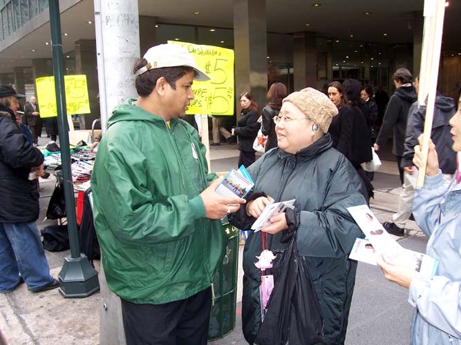 邹伟说,我在华尔街发真象资料的时候,碰到一位白领的西方人士,他说法轮功是他在纽约见到的最持久的一个团体。他说,“今天早上,我在公园大道发资料的时候,一位美国人把星期一的纽约时报递过来,上面刊登了法轮功学员在曼哈顿讲真象的报道,他说他已经看了介绍法轮功的文章,并把报纸给了我。”