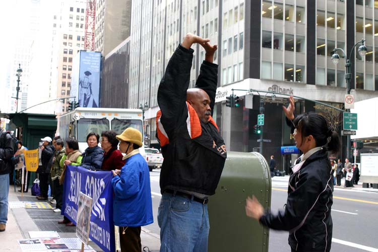 一位纽约人对法轮功学员说,如果每个人都关注法轮功,迫害一定会很快结束。你们做得很好,一定要坚持下去。