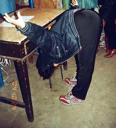 的大法弟子“开飞机”,腿与身体呈直角,双手高举,使被迫害者苦不堪言,汗水将水泥地打湿了一大片,并将头塞到桌子底下。