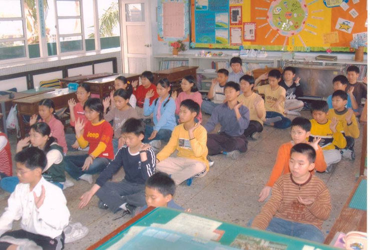 班导还利用中午休息时间让我们打坐,并在早自习时间让我们读法,班导还利用下午最后一节,让我们看李洪志老师讲法的录影带,班导为了让我们学法,自掏腰包一人买一本《转法轮》给我们看,班导说能看到这本书,是前世修来的福气呢!这本书,令我获益匪浅,真是谢谢班导!自从炼了法轮大法,我的课业进步了,尤其是体育,更是突飞猛进,运动会时,从以前的候补到现在的第3棒,内心真是欣喜若狂,但我赶快告诉自己,不能起欢喜心。在打坐时,我若认真打坐,便会看到蓝色与白色的花纹及隧道,但我不认真打坐时,便什么也看不到,不可以睡着或打瞌睡否则白炼,我必须愈来愈精进才行!看到李洪志老师大公无私、救度众生的精神,真是让人赞叹,因此我要把握当下,常看《转法轮》,从五年级到现在,我已看过5遍《转法轮》,我还要介绍给爸妈、家人、邻居看,帮助更多人身心健康。”