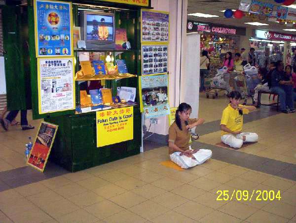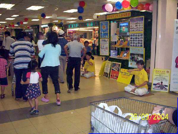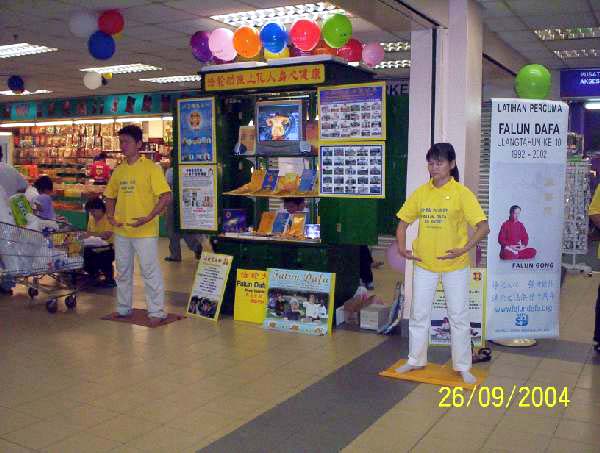 【明慧网2004年11月24日】2004年9月23日至30日期间,马来西亚新山的法轮大法学员在当地的家乐福超级市场租了一个摊位,摆放了洪法展板并向人们介绍法轮大法洪传世界的盛况,同时也摆放大法书籍,并在人多的时候示范功法。
