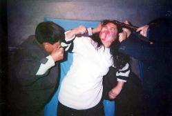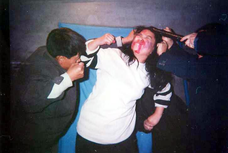 ,四、五个人把我摁倒在地,拽胳膊、拽腿、摁头,小拇指粗的红胶皮管从鼻子插到胃里灌大量盐加少些豆粉,灌完每次拽出来时管子上面带很多血,灌完后,感觉心如刀绞,总想吐,还吐不出来,再加上头也疼,那滋味很痛苦。