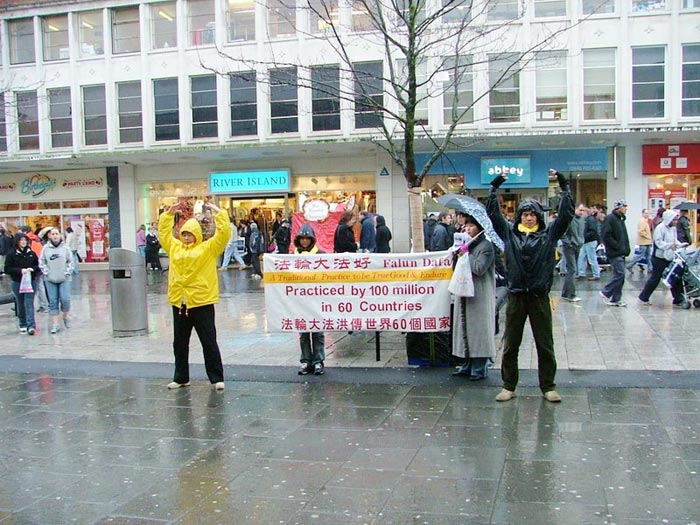 这一天正好是南安普顿市今年下第一场雪,气温降至零下2度,而且一整天阴雨连绵,但是恶劣的天气丝毫未能阻挠学员们的洪法计划。中午12点,当外地赶来支持的学员到齐后,大家在街旁拉起横幅,反复演示功法,给来往路人发法轮功真象资料。很多路人为法轮功祥和的音乐和优美的功法所吸引,纷纷询问当地教功点的信息并索取资料,一些人主动上前和学员交谈。学员精心制作的纸荷花一会功夫就被抢光了。一位20来岁的男子主动向学员要了一份资料,并钦佩的向学员竖起了大拇指。下午四点半当活动结束时,事先准备好的1500份资料已全部用完。