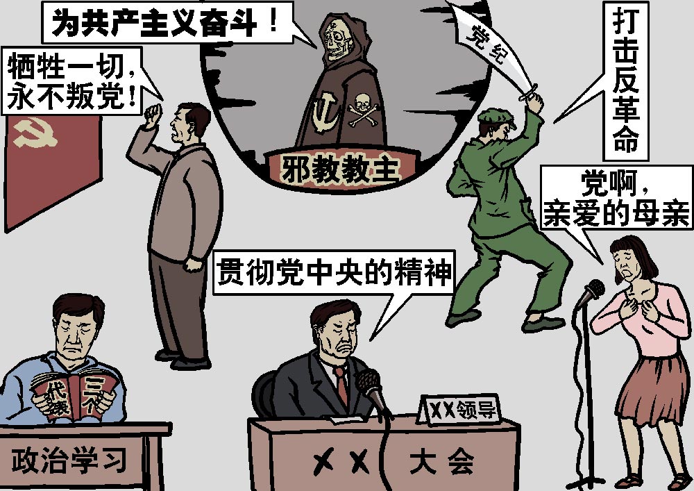 以共产党为国教的中国,不容任何异见团体。连被拿来当政治花瓶的“民主党派”和被改造了的“三自”教会,都得宣告接受共产党的领导。先忠于共产党,再信奉上帝,这就是共产党的邪教逻辑。