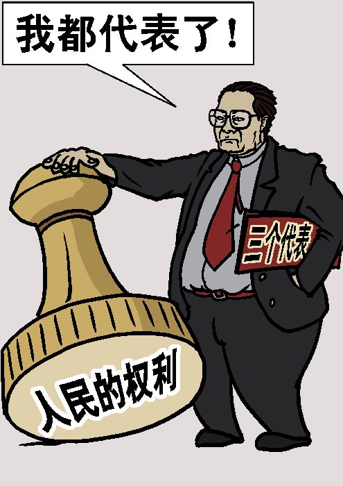 从马克思到江泽民,共产党领袖的画像要悬挂起来让人膜拜,领袖的绝对权威不容挑战。毛泽东成为“红太阳”、“大救星”,他的话“一句顶一万句”。身为“普通党员”的邓小平曾太上皇式地主宰中国政治。江泽民的“三个代表”含标点符号总共才40几个字,却被中共四中全会的决定笑话式地标榜为“回答了什么是社会主义、怎样建设社会主义的问题,创造性地回答了建设什么样的党、怎样建设党的问题,是对马克思列宁主义、毛泽东思想、邓小平理论的继承和发展。”