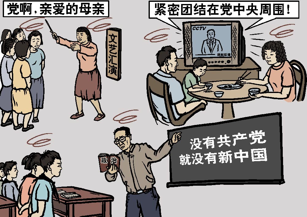 共产党灌输其政治说教,从小学、幼儿园就开始,以后的升学晋级总脱不了政治考试(核),而那些政治考试题,根本就不容学生独立思考,必须靠死记硬背共产党的标准答案才能及格。可怜的中国人,为了考试,不得不从小自动重复着共产党的说教,一遍又一遍的自己给自己洗脑。政府的上层干部提升,不论是不是中国共产党员,都要到党校去学习。合格的毕业之后,才能晋级。