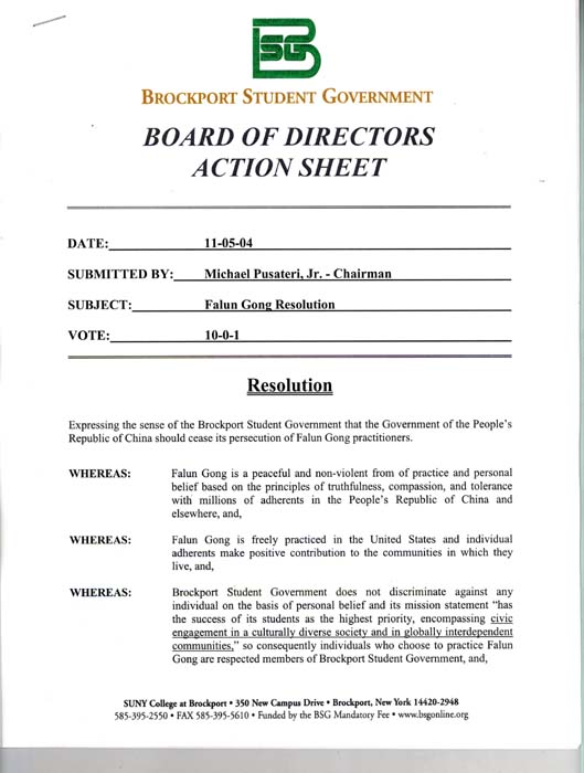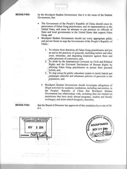 鉴于,布鲁克波特学院学生管理机构不因为信仰而歧视个人,本机构的宗旨是“以学生的成功为首要,鼓励人们溶入多元文化的社会和全球相互依存的社区之中,”因此,布鲁克波特学院学生管理机构的成员尊重选择修炼法轮功的人们;并且