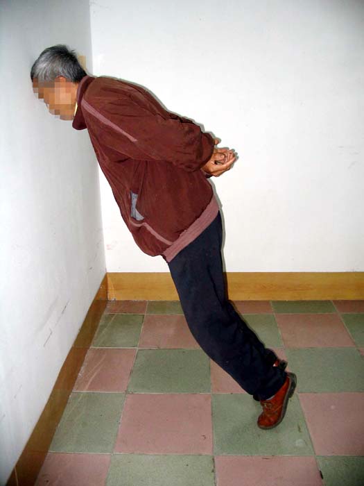 刑法:用手铐背剑式反扣双臂,弓身,直膝,撅臀,头低过臀部一直用刑三个多小时。然后由两名恶警悬提架空身躯往地下墩,直到腿骨酥软不能站立,腰不能直,腕部勒出血痕印也不罢休。