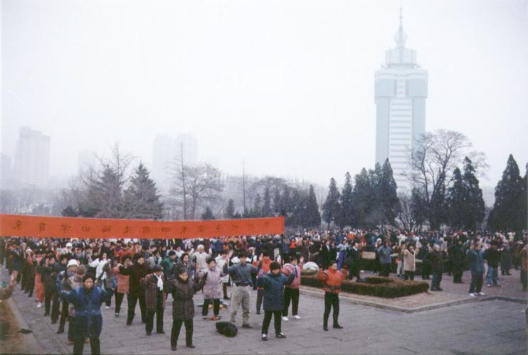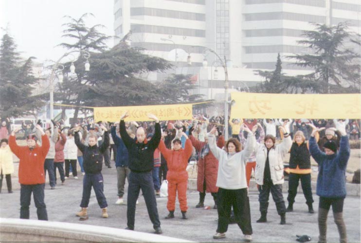 历史图片:威海环翠区法轮功学员在市府前广场集体炼功