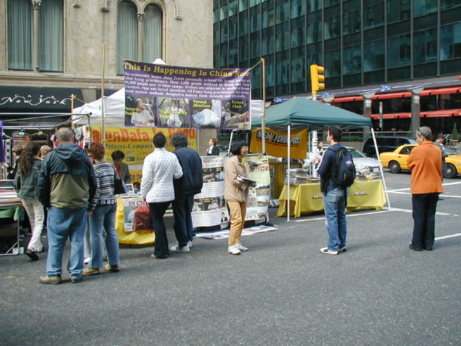 一位西方人站在我们的展位前仔细的看展板,学员和他攀谈起来,原来他祖籍是伊朗,在一次中国大使的公众讲话中知道了法轮功,有很负面的看法。后来在美国西部接触到了几位法轮功学员,还是对法轮功不了解。学员指着酷刑展的图片告诉他正在中国发生的持续5年的迫害,迫害为什么发生,法轮功学员为什么来到纽约。他终于明白了真象,非常高兴,很感谢学员的努力。