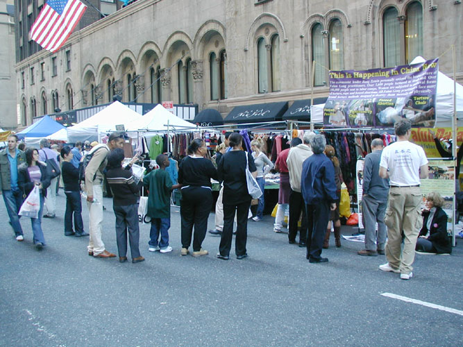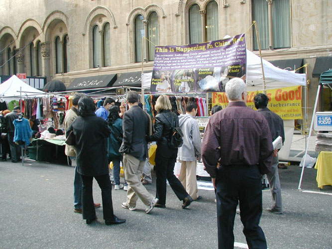 和法轮功学员展位比邻的一个小伙子是卖衣服的,他和学员分享了一个故事。一个妇人走到他的展位里挑衣服,同时告诉他和同伴:“你们和他们(法轮功学员)比邻,真的很幸运。法轮功很好。有一段时间我不太舒服,不停的打喷嚏,可是我走到他们在中央公园的炼功点附近站着,就觉得特别舒服,也不打喷嚏了。”