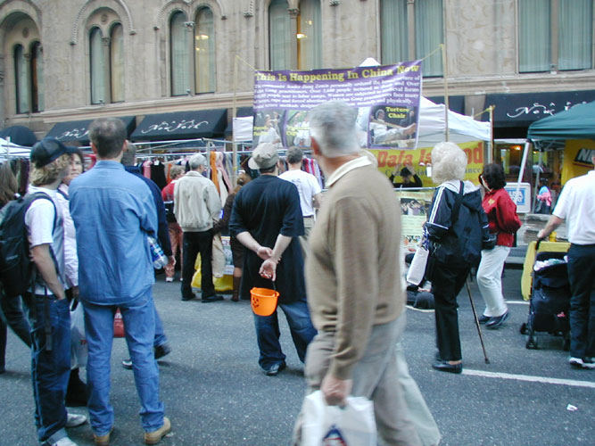 自2004年8月开始,每个周末法轮功学员的展位成了街市上一道独特的风景。每个周末这里都有一些很感人的故事发生,这里选择2-3事和大家分享。