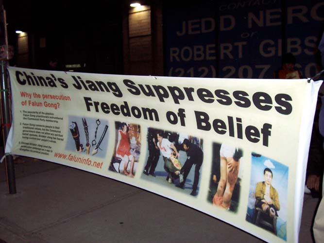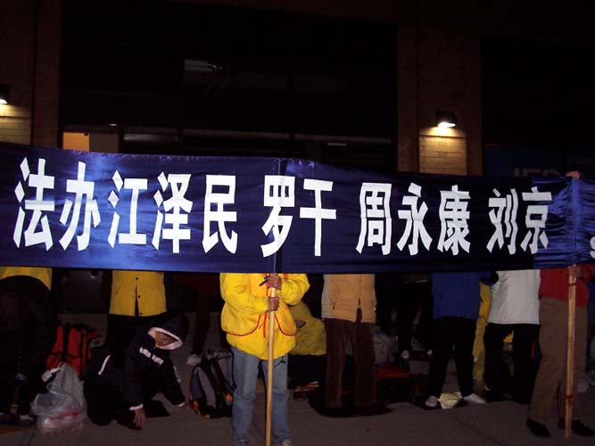 ![]() 横幅表达了法轮功学员的心声 | ![]() 揭露迫害真象的横幅 | ![]() 中领馆前烛光守夜 |