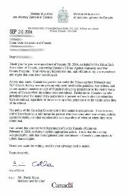 加拿大司法部长、最高检察官欧文-考特勒先生在2004年9月30日就惩办迫害法轮功学员的罪犯致信加拿大法轮大法学会。