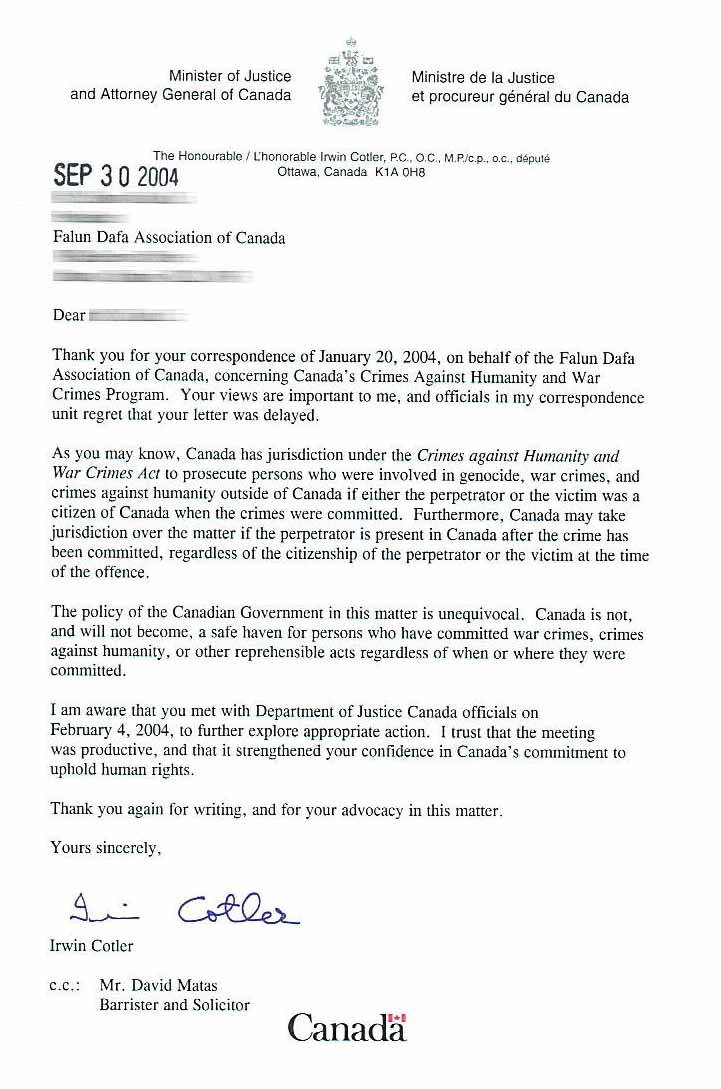 感谢你代表加拿大法轮大法学会于2004年1月20日就关于使用“加拿大反人类罪和战争罪方案”的来信。你的观点对我很重要,很遗憾我们通讯部门的官员不能及时回复你的来信。