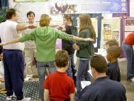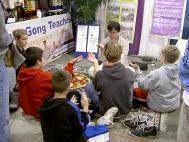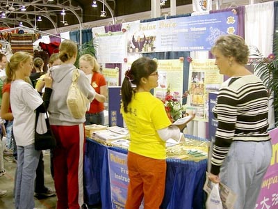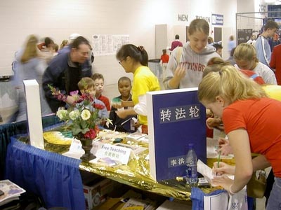 许多孩子围绕在展台的周围,聚精会神的看着学员炼功,还有不少孩子会立即坐在学员的身边,跟着学员一起做动作;更多的学生则争先恐后的让法轮功学员在自己的手臂上和随身带的本子里盖上“(Falun DaFa Hao)法轮大法好”的印章,然后一个个读着“法轮大法好”,开心的说着谢谢。展台上漂亮的法轮大法洪法书签也让孩子们更加直接的了解了大法,知道了法轮大法好! 其中一些高年级的学生还会提许多问题,相信经过和学员的交谈,他们年轻的心里已经埋下了美好的种子。