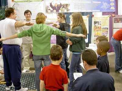 和学生们一起来到国际节的还有许多老师和家长,通过学员的介绍,他们也对法轮大法真象有了不少了解。几乎所有了解真象的人都对在中国遭受迫害的法轮功学员表示了同情,对大法在中国遭受的残酷镇压表示震惊,对大法的美好表示了赞许。还有一些家长当场就带着自己的孩子开始学炼法轮功。有一位西方家长在和学员交流之后,对大法产生了强烈的兴趣,还特地叫来三个孩子,一起跟着学员炼动功,并表示会支持大法和法轮功学员。