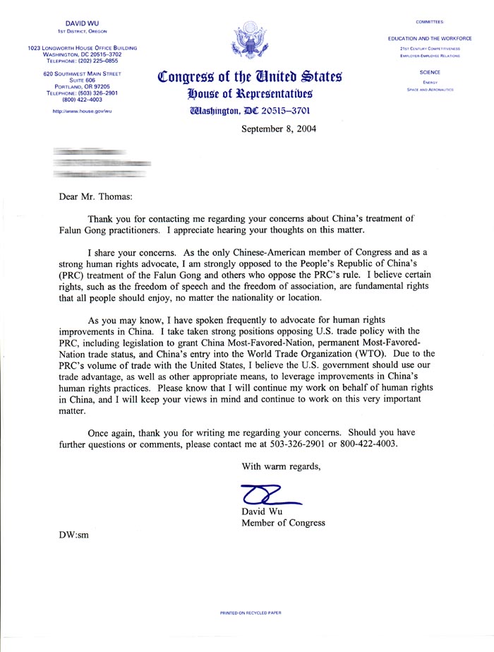 吴振伟议员在信中感谢法轮功学员来信表达对中国[江氏集团]迫害法轮功学员事件的关注。他说,我和您有同感。作为众议院唯一一名美籍华人和强烈倡导人权者,我坚决抗议中华人民共和国[江氏集团]对法轮功学员以及其他反对其政策者的迫害。我相信诸如言论自由和结社自由等某些权利是所有人都拥有的基本权利,它是不分国籍和地点的。