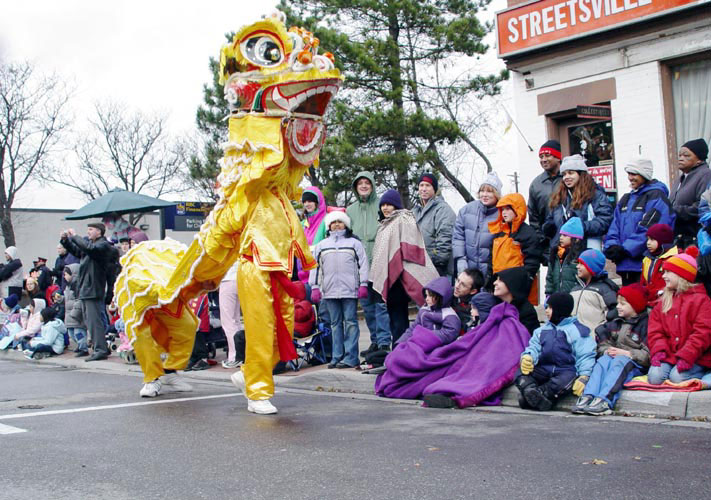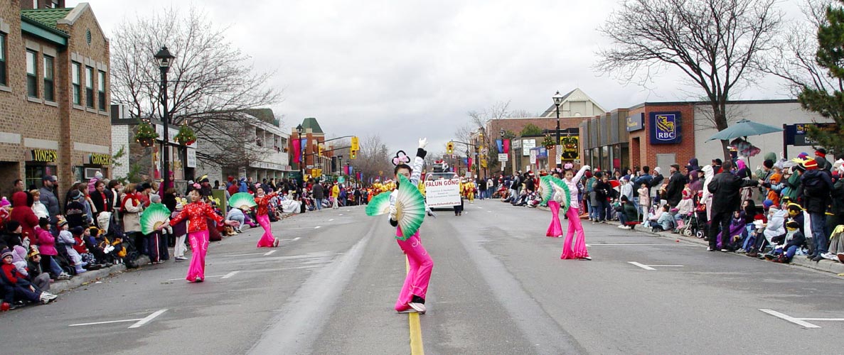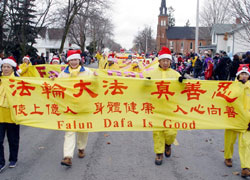 当天的天气寒冷,北风呼啸,还下起了冰雨。但观众仍然热情高昂。法轮功学员的队伍阵容庞大,有功法表演、舞狮队、腰鼓队和舞扇队。观众不停的向学员们鼓掌和挥手欢呼。一位每年都来观看游行的中国观众说:“法轮功的队伍阵容一年比一年大,花样也一年比一年多。”维持治安的警察微笑着竖起大拇指并告诉学员:法轮功的游行团队是所有参与团队中最棒的!