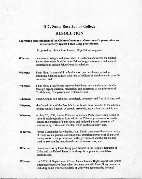 鉴于,法轮功学员致力于通过气功锻炼,打坐和遵循真、善、忍的原则获得内心的宁静和健康的身体;
