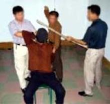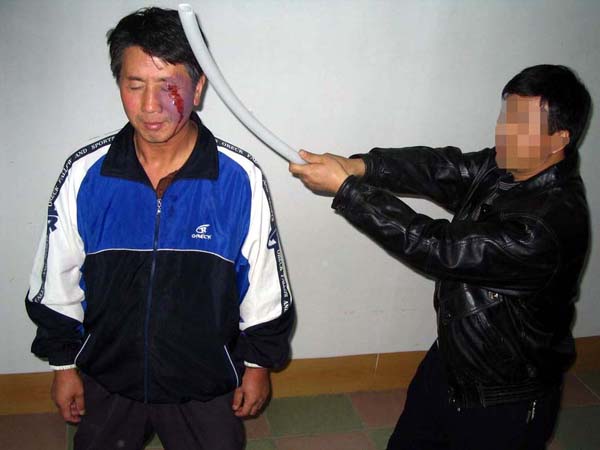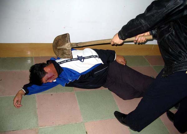 2001年5月,在吉林省辽源劳教所非法关押期间,我被强制出工,挖地缆线沟。在辽宁省昌图县、新沙河挖沟时,劳教所恶警利用刑事犯张××用铁锹砍我,当时我被连砍4锹,第二锹就将我砍倒。我的左腿关节处被砍骨折,我的裤子被砍到身体长脓包的烂肉里去,我失去了知觉、昏过去。当时在场的人有的犯人被这种非人狠毒的毒打吓得闭上了眼睛不敢看,有的求他们不要打了,有的流下了泪水。恶警、恶人们的目地就是要逼我放弃修炼大法,并威胁我说打死就地埋沟里,劳教所有死亡指标,上边让干的。(演示图2、3、4)