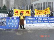2004年12月10日是世界人权日。11日莫斯科法轮功学员顶着严寒,在莫斯科国民经济展览馆对面的和平大街沿街设立展板、标语牌和模拟在中国发生的江氏集团对法轮功学员的酷刑折磨。标语牌用俄-中两国文字写着:“真、善