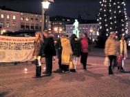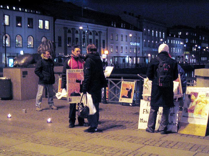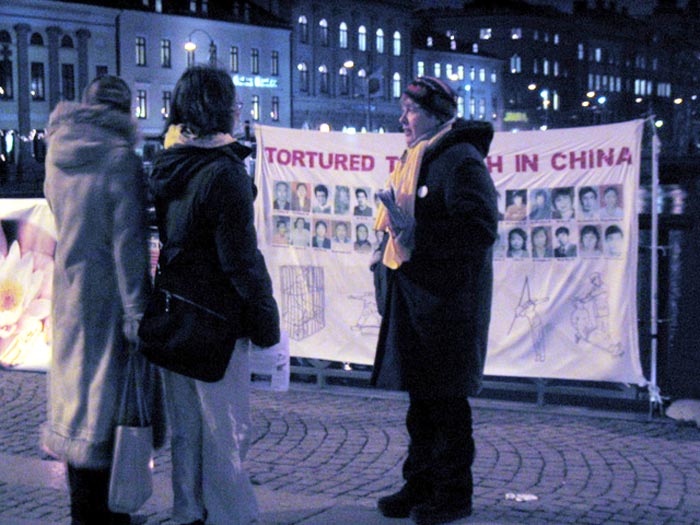 【明慧网2004年12月13日】2004年12月10日,瑞典哥德堡的法轮功学员到市中心向耶诞采购人潮及通勤人士讲真象,许多人停下脚步阅读展板上的信息,并注视写着中国江氏集团所犯下的侵犯法轮功学员人权罪行的横幅。他们对这场在中国发生的人权表示关切,鼓励学员持续反迫害,并在支持学员呼吁终止迫害的请愿书上签名。