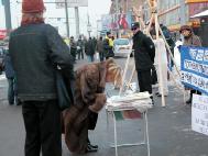 有的人开始没接资料,当他们看过全部真象展板之后,主动的接了学员们递过的资料。有的人虽然匆匆而过,但他们看到横幅标语却不住的点头。有的学员跑到公交车上给司机送资料,有的司机鸣笛向法轮功学员们示意。