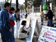 人们纷纷在签字表格和签字图板上签名声援法轮功学员。一位法律系教授在了解了真象后当即签名表示支持法轮功学员,并表示他将会把这件事作为研究课题,让他的学生、同事以及更多的人了解在中国发生的这场迫害。