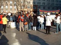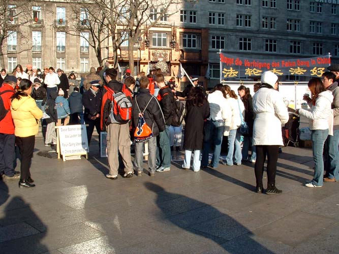 今年冬天,德国气候寒冷,位于科隆大教堂前的展台正处于一个风口上,这里的平均温度低于周边地区。刮大风的时候,往往整个人都会被吹得跑来跑去。“一个不动就制万动”(《在美国中部法会上讲法》),我们的学员在这里就能做到炼第二套功法的时候纹丝不动。但是,一整天八个小时站在这里,可不是一件简单的事。一位周一至周四每天去展台的同修在气温突降的第二个星期吐了。其他的同修听到了,心里都很难受。有安慰她的,有帮她一块分析心性问题的,也有一位忙着张罗试图在国内买棉裤的。为了找到实用又合适的服装,来来回回电话卡都用了好几张。选好后,没有人跟她讲一下子就买了八、九条。拿到温暖又很合适的裤子的当天,她笑盈盈的说,“这下好了,这个冬天去哪儿讲真象都不怕冷了。烛光守夜都不怕冷了。”