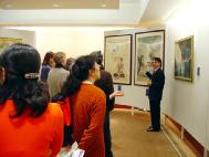 在酒店二层华盛顿和汉密尔顿大厅,参观者有幸观赏画展。“坚忍不屈的精神”画展陈列在汉密尔顿大厅,正中是著名雕塑家张昆仑的作品——佛像,大厅四周陈列着15幅作品,主要是油画和粉蜡画。画家汪卫星、王志平专程赶到波士顿参加画展,其中展出了他们的作品共9幅。