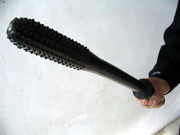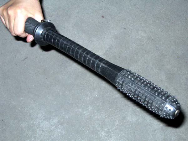 ![]() 恶警毒打侯占海时所用的凶器--“狼牙棒” | ![]() “狼牙棒”里面灌铅,打人时外表无明显伤痕,但却可严重伤人内脏 |