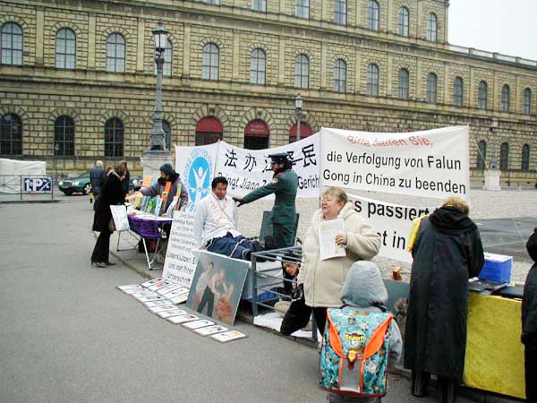 一位德国女士看到展位之后直接走向签名簿,她表示已从明星杂志(Stern)上得知镇压的消息,希望从道义上支持法轮功。另一位女士签完名后对表演酷刑展的大法弟子说:“祝你们好运!”