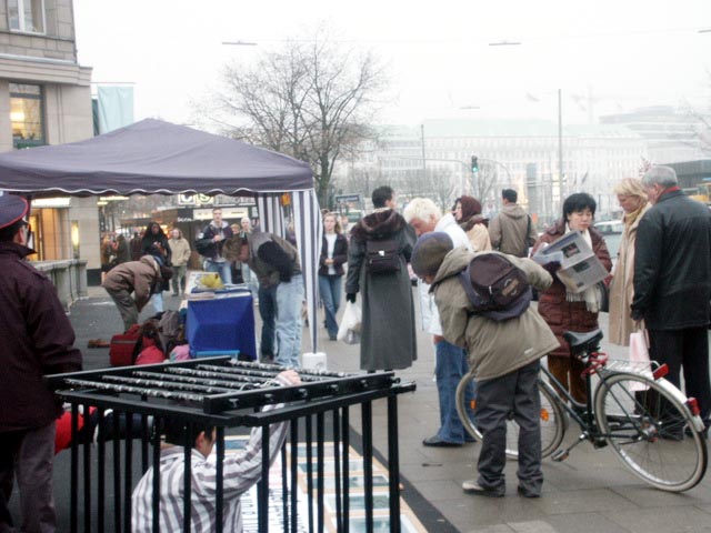 11月11日星期四,一位男子停下来与正在发迫害真象传单的学员交谈,他说:“你知道吗,在我们交谈之际,有一场以中欧会为主题的汉堡经济会议正在举行?”学员告诉他这就是我们在此的原因,他问为什么你们不在市政厅前请愿,让那些人们可亲眼看到反酷刑展?学员向他解释:“我们也很想把我们的展位设在那里,但是我们无法做,因为那个特别的地点是禁止進行请愿的。”这位男子告诉学员:那么你们应该在商务部或大西洋旅馆(Hotel Atlantic)外面集会。这位男子态度很认真的说,他想要让那些经济人士和中国代表团遇见学员们的反酷刑展。当学员告诉他我们会接受他的建议时,他感到非常高兴,深表感谢,然后在呼吁停止迫害的请愿信上签名,并拿了许多真象小册子。