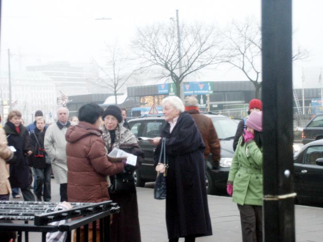 一位年长的女士停下来看展览,她很诚恳的说,“向全世界展示共产党干的所有恐怖事情,真是太好了!”她认为中共所干的这一切完全出自于妒嫉,她也告诉学员们她在一个波兰的劳改营中也因为类似的原因而受到过酷刑折磨,她经常做恶梦以及想起她以前所承受的酷刑,她衷心的希望中国的法轮功学员能很快的从苦难中被解救出来。她也签了请愿信,并给学员们最好的祝愿。