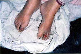 2002年9月至2004年9月,王良均一直被关押在都匀的监狱,他在床上整整躺了两年。2004年9月他被六盘水公安拖回后扔在家中,至今卧床不起。他的双耳几乎失聪,已经听不见亲朋们对他说什么了;他看字要手指头大的字才能勉强看见。他一句又一句的告诉周围的人:“我被拖怕了,我被拖怕了!”“他们把我拖着(在地上)走,我被拖老火了(严重了)!”“我被饿坏了!”(他曾被饿过十五天)。他的颈部在监狱被折磨受伤,至今还有如项链一圈的伤痕(见上图),现在他说话发音也不太清楚。从他断断线续的讲述中,让人已经感受到他在都匀的监狱中经历了地狱般的残酷折磨。