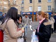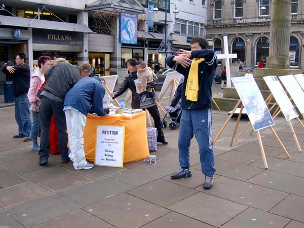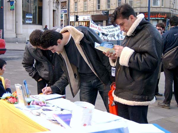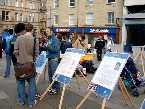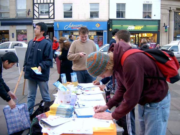 还有一位赫得斯菲尔德的学生,他刚读过一遍《转法轮》,也在下午赶来,参加活动。他积极主动的向路人讲真象。