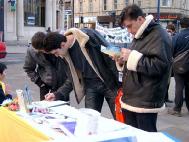 当天天气晴朗,学员们在赫市市中心广场支起了征签用的桌子,拉开了横幅,还撑起了揭露中共江氏集团如何以酷刑迫害法轮功学员的展板。很快,周围的路人就被展板吸引了过来。学员们向他们说明这些现在正在中国发生。人们听后纷纷签名,表示支持法轮功学员。