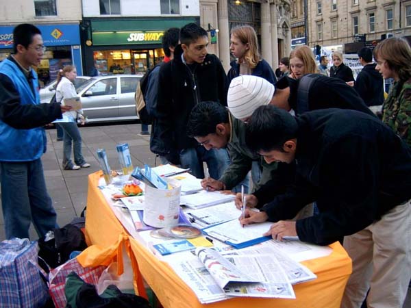 下午,一位英国女生来到征签的桌子前,签名后,又仔细的阅读展板。这时,一位学员走过去问她:“要不要给你一些传单带去给你的朋友?”她说:“不用,我就在这里发。”于是她就站在展板旁边开始发真象资料,还不停的对路人讲着法轮功学员受迫害的真象,还让大家去征签表上签字。结果很多路人纷纷签名。一时间,征签桌前就排起了长队。这位英国女生待了很久才离去。