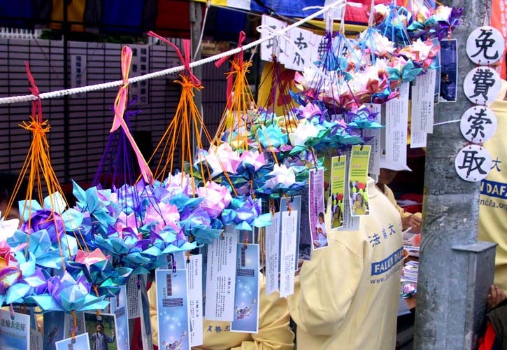 19日是活动的第二天,乡公所给学员提供一个宽敞的服务区。这天服务区人潮络绎不绝,纷纷前来索取法轮功相关资料,大法洪传及迫害真象看板吸引了很多乡亲的目光,驻足观看。学员把用心制作的纸莲花赠送给来索取资料的乡亲。现场人潮踊跃,苏乡长亲自来到服务区给学员加油打气。
